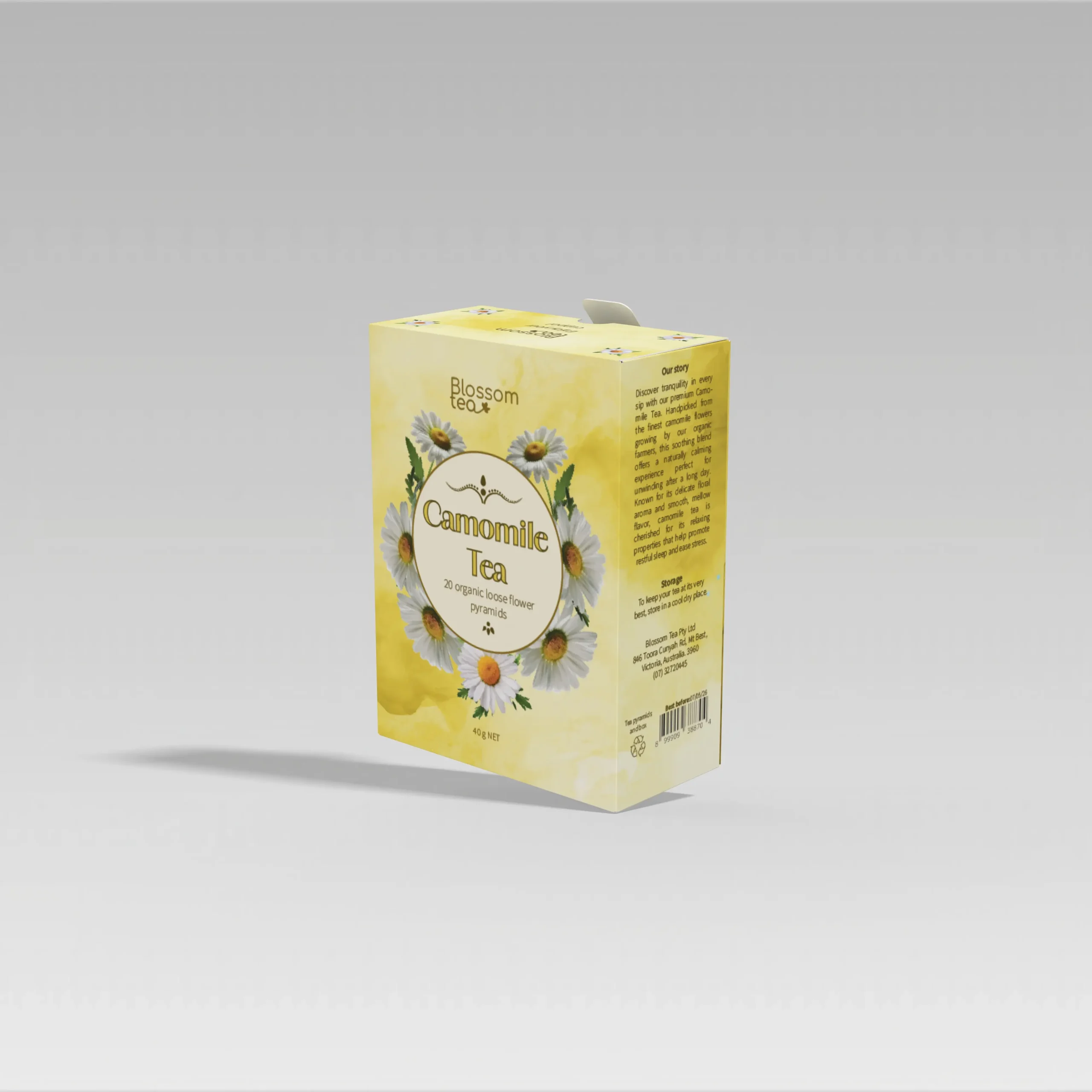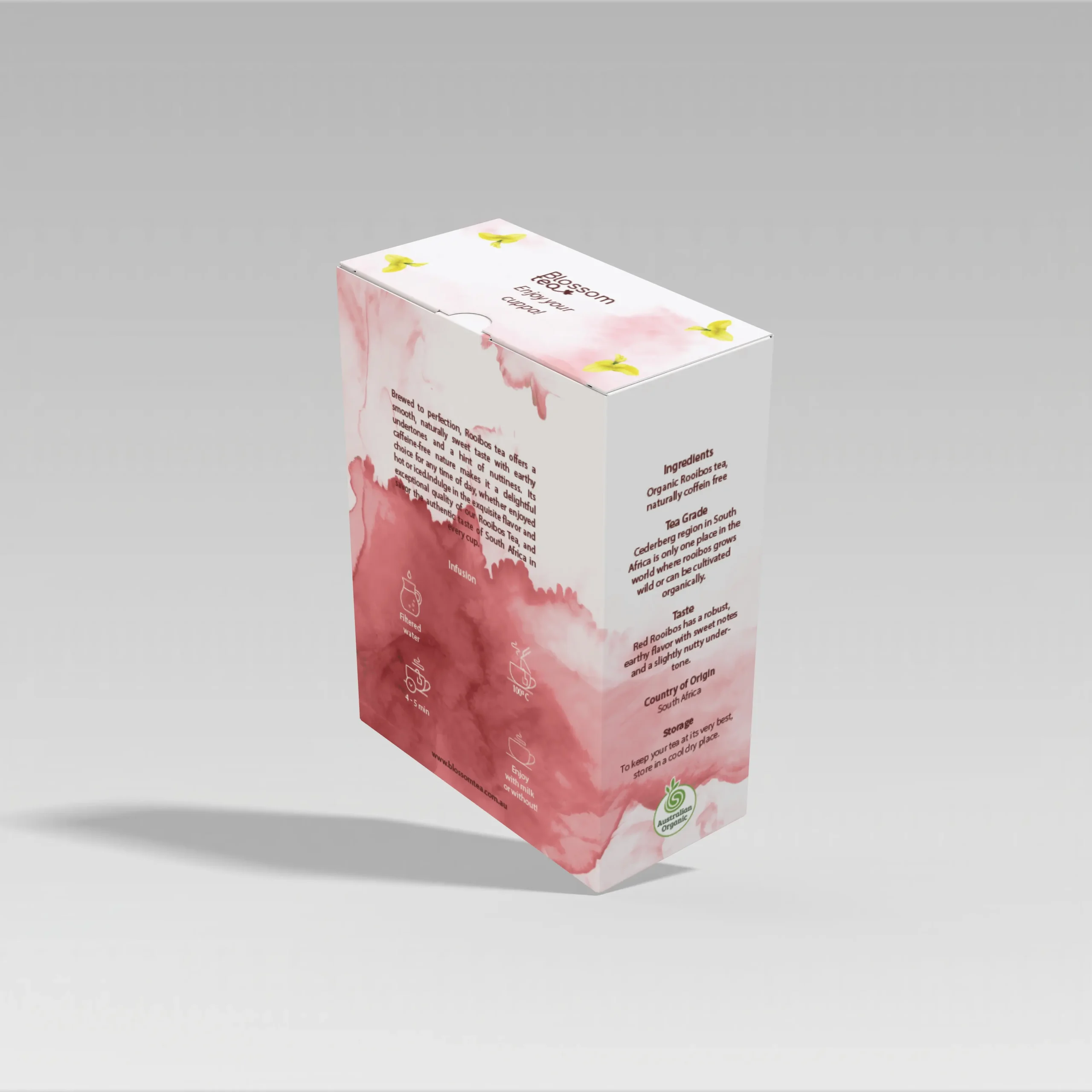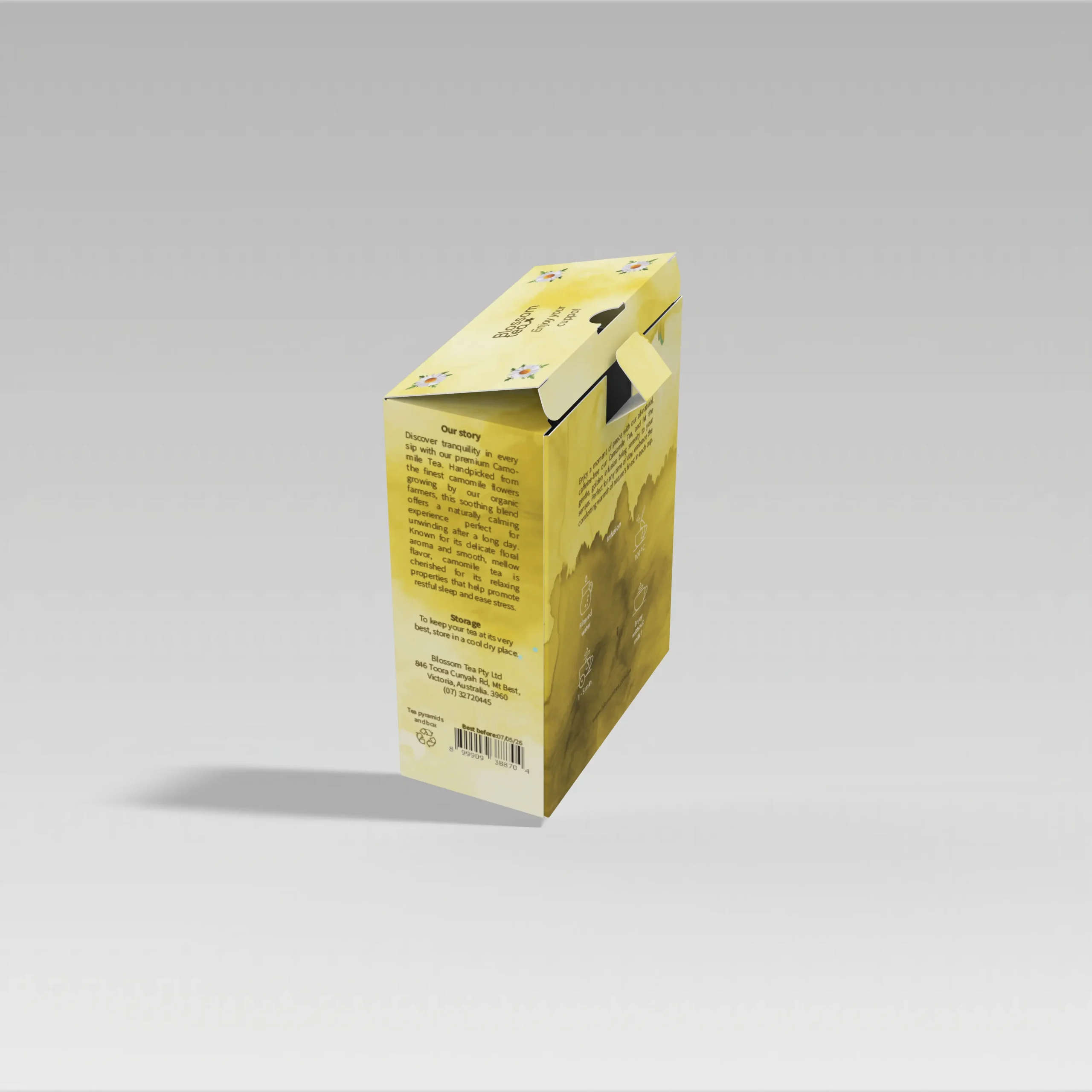 Every tea has its own character, and we wanted each box to reflect that personality. The Chamomile Tea is calm and soothing, with soft golden tones and delicate flowers that suggest relaxation. The Green Tea with Jasmine feels fresh and uplifting, its light green palette echoing the crisp notes of the tea itself. And the Rooibos Tea uses warm, earthy reds and yellows, symbolising strength and natural richness.