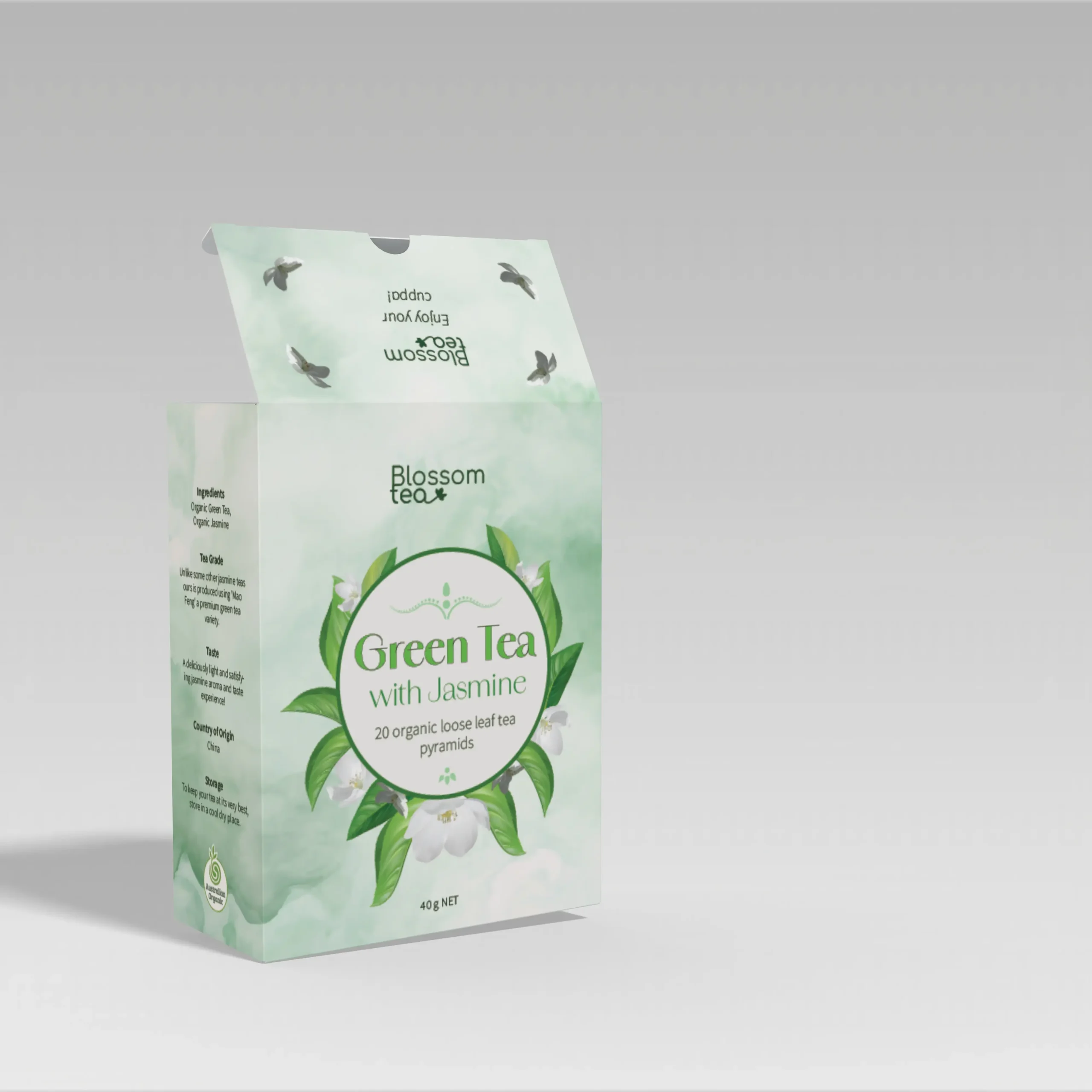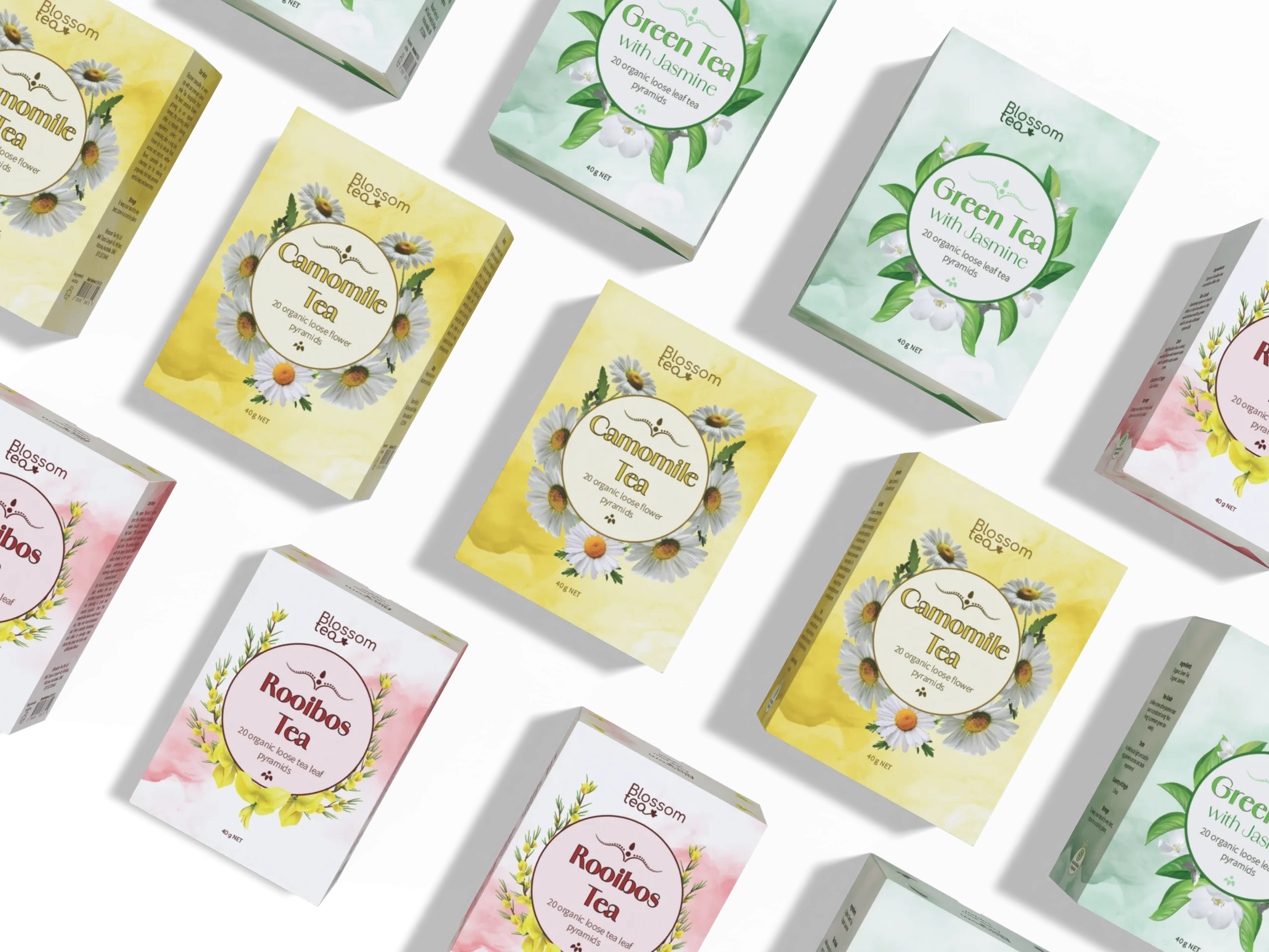 Style: Minimalist design with strong focal imagery ensures the tea type is immediately recognisable, while decorative botanical elements add storytelling layers.